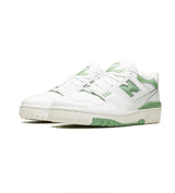 La New Balance 550 White Mint Green se pare d'une tige en cuir lisse blanc, complimentée par quelques empiècements en cuir perforé. Le vert menthe présent notamment au niveau des brandings et de la languette offre un joli contraste avec le reste de l'empeigne.