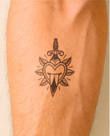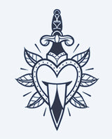 Un cœur transpercé par un poignard, entouré de feuilles. Il symbolise l'amour trahi, la force dans le chagrin ou un symbole classique de douleur persistante