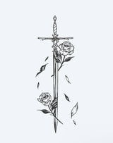 Un tatouage minimaliste en ligne noire représentant une épée ornée entrelacée de roses en fleurs et de pétales tombants, symbolisant la beauté et la force en équilibre.