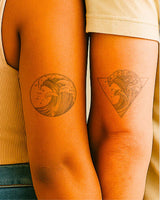 Deux tatouages de vagues saisissants : l'un dans un cercle et l'autre dans un triangle. Tous deux symbolisent la force et la beauté de l’océan et montrent la puissance imparable de la nature. Un tatouage parfait pour quelqu'un qui se sent connecté au pouvoir de la mer.