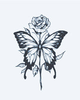 Un papillon délicat posé sur une rose en fleurs symbolise la transformation, la beauté et les nouveaux départs. Les détails doux capturent à la fois la fragilité et la force dans la conception harmonieuse de la nature