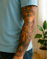 Tatouage détaillé de style réaliste représentant une figure de Madone, un enfant ange et une personne sur un chemin forestier sombre. Le design contient des ornements gothiques et un symbolisme spirituel.