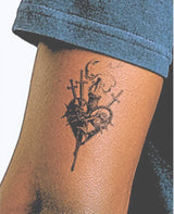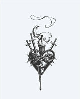 Un cœur saignant, enveloppé d'épines et percé d'épées, s'élève avec de la fumée montante et une flamme de bougie. Ce tatouage temporaire spectaculaire évoque les thèmes du sacrifice, de la persévérance et de la lutte spirituelle avec un art gothique aux détails envoûtants.