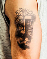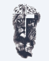 Ce tatouage réaliste détaillé, noir et gris, montre le visage d'un lion et un Jésus en prière, couronné d'épines, divisé par une croix lumineuse. Ci-dessous, trois croix de crucifixion apparaissent sur un ciel nuageux, symbolisant le sacrifice et la foi.