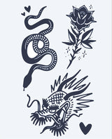 Un ensemble de symboles puissants : une épée enveloppée d'un serpent, une toile d'araignée, une ligne brisée et « TRUE LOVE » avec un poignard. Ces dessins représentent la force, l'amour et la résilience, combinant le danger et la dévotion d'une manière fascinante.