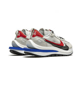 La Nike Vaporwaffle Sacai Sport Fuchsia Game Royal se pare d’une empeigne blanc cassé composée de mesh pour les quarter panel et de suède et cuir sur le reste de la paire. Des accents de rouge et de noir sur les éléments de branding ainsi que du bleu sur la semelle intermédiaire ravivent l’ensemble et créent un effet contrasté. Finalement, on retrouve l’aspect déconstruit qui sublime l’ensemble par l’intermédiaire des languettes, des semelles dédoublées et des Swoosh (l'un en cuir et l'autre directement peint sur le suède et le mesh) .