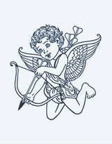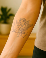 Un charmant tatouage de Cupidon, le dieu de l'amour, prêt à frapper l'amour avec son arc et ses flèches. Un design parfait pour exprimer la romance et l'affection.