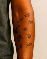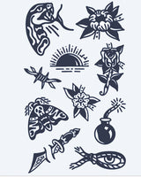 Un ensemble de motifs audacieux : un serpent saisissant, des roses en fleurs, un coucher de soleil, un poignard enveloppé dans un ruban, une bombe et un crâne de papillon. Ces symboles représentent le danger, la beauté et la transformation.