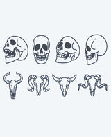 Une gamme de modèles de crânes, y compris des crânes complets et des crânes d'animaux, montrant différents angles et styles. Ces tatouages symbolisent la mortalité, la force et la beauté brute de la vie et de la mort. Parfait pour quelqu'un qui embrasse le concept de la fugacité de la vie et le pouvoir de l'esprit animal.