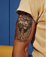 Une croix avec les visages de Jésus portant une couronne d'épines, un lion rugissant et un ange en prière sur le sol. Le design symbolise la foi, la force et la protection divine en combinant la spiritualité et le courage.