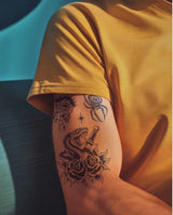 Un ensemble de motifs audacieux : un œil avec un éclair pour la perspicacité, une araignée détaillée symbolisant la patience et un serpent enroulé autour de roses, alliant force, danger et beauté.