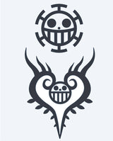 Un tatouage représentant le Jolly Roger de One Piece, avec le crâne souriant emblématique et les os croisés. Le premier dessin est le symbole des Pirates du Chapeau de Paille, le second a un cadre en forme de cœur autour de lui. Un hommage parfait pour les fans de l'équipage aventureux de Luffy !